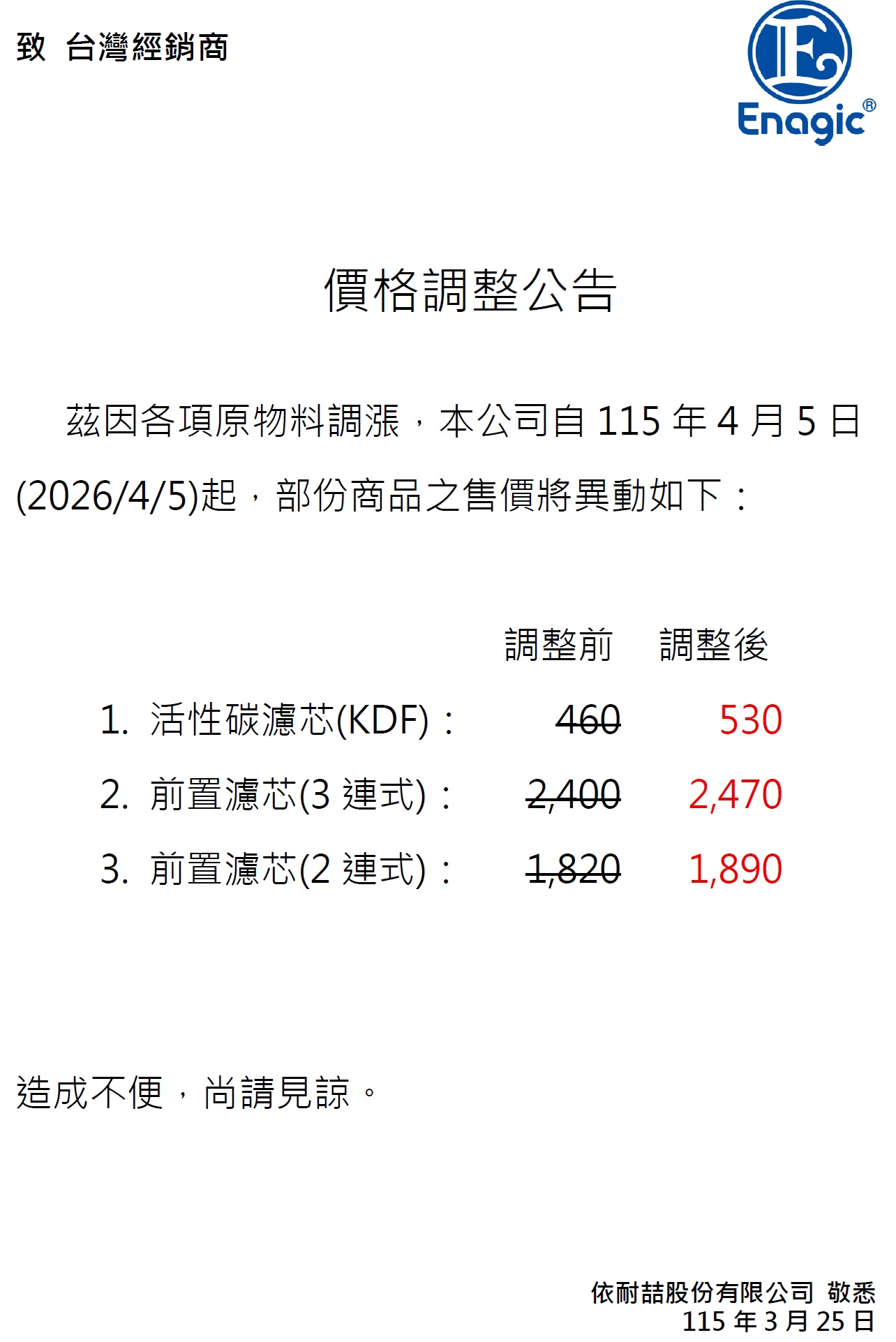 【價格調整公告】自115/4/5起KDF及部分販促品